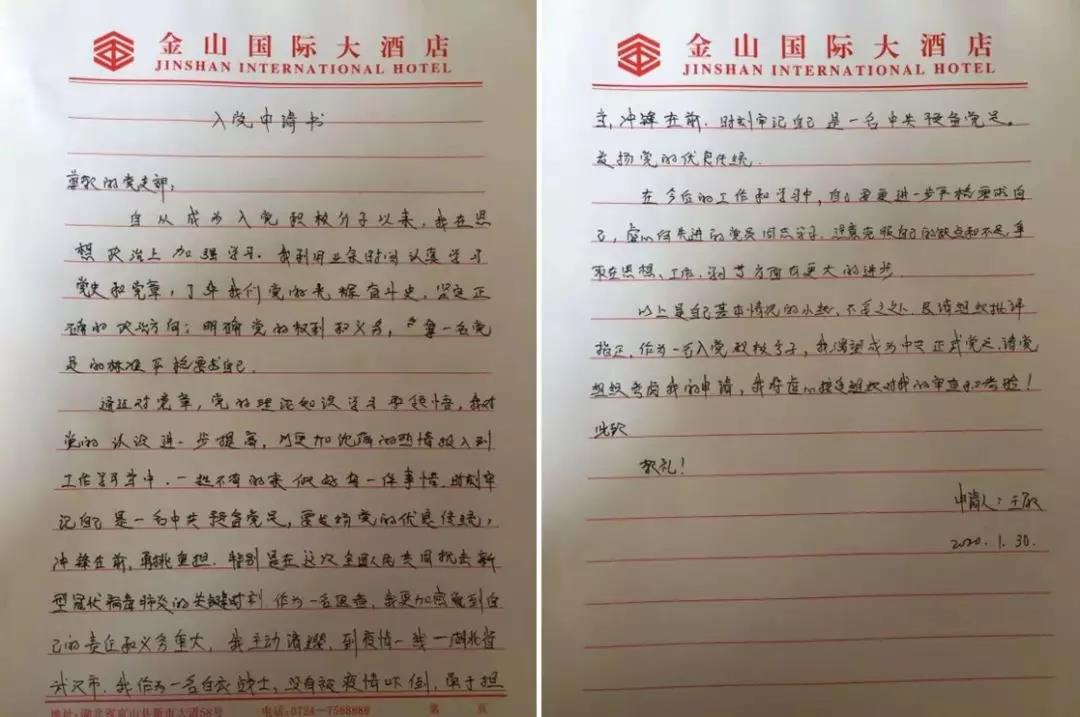 1月30日,在武漢戰(zhàn)“疫”第一線,短短的兩天,讓青年護士王敏、王曉霞最驚訝、最感動的就是防控疫情黨員先行,最危急的關(guān)頭、最危險的地方總有共產(chǎn)黨員沖在前面,“我是黨員我先上”成為最響亮的口號。到達武漢的第二天,她們就向內(nèi)蒙古衛(wèi)健委成立的援助武漢臨時黨支部遞交了入黨申請書。她們表示,要在武漢防疫一線努力工作,向黨員同志學習、看齊,以實際行動早日成為一名正式的共產(chǎn)黨員!