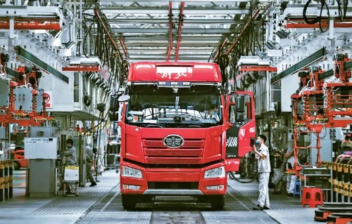企業(yè)強(qiáng)則國家強(qiáng),加快建設(shè)世界一流企業(yè)是全面建設(shè)社會主義現(xiàn)代化國家的重大任務(wù),是新時代國有企業(yè)的戰(zhàn)略目標(biāo)。近來,一汽解放集團(tuán)股份有限公司生產(chǎn)按下“加速鍵”。圖為2022年6月15日,工人在位于吉林長春的一汽解放總裝車間內(nèi)裝配車輛。 新華社記者 許暢/攝