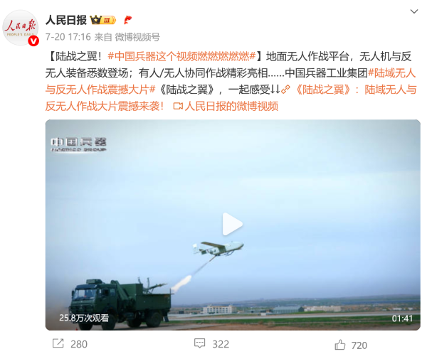 7月21日,中國(guó)兵器工業(yè)集團(tuán)有限公司在位于內(nèi)蒙古的某試驗(yàn)場(chǎng)舉辦軍貿(mào)陸域無(wú)人與反無(wú)人作戰(zhàn)體系主題日活動(dòng),攜無(wú)人機(jī)、巡飛彈、反無(wú)人機(jī)等最新武器裝備登場(chǎng)亮相,展現(xiàn)了一場(chǎng)無(wú)人與反無(wú)人領(lǐng)域激烈對(duì)抗的實(shí)戰(zhàn)場(chǎng)景。中央主流媒體、地方媒體、知名網(wǎng)絡(luò)媒體,以及集團(tuán)公司各宣傳平臺(tái)紛紛進(jìn)行報(bào)道,多次登上熱搜,引發(fā)廣泛關(guān)注。